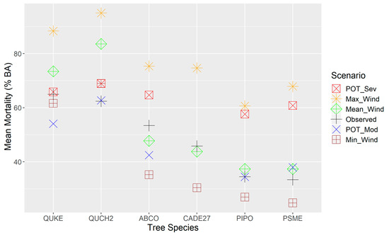 The most accurate weather scenarios for predicting mortality also varied at the tree species level. The Mean Wind scenario produced the lowest mean error for white fir (Abies concolor (Gord. & Glend.) Lindl. Ex Hildebr.), incense-cedar (Calocedrus decurrens (Torr.) Florin), Ponderosa pine (Pinus ponderosa P.&C. Lawson), and Douglas-fir, while the Min Wind scenario had the lowest mean error for canyon live oak (Quercus chrysolepis Liebm.) and California black oak(Quercus kelloggii Newberry) (Figure 3). Mean observed stand-level mortality was close to 60% for both hardwood species, near 50% for white fir and incense-cedar, and less than 35% for Douglas-fir and Ponderosa pine. The Min Wind scenario performed best in reducing RSME and MAE (Table 7).