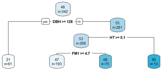 We used regression trees to assess, independently of FVS-FFE, the relationship of the RAWS weather and stand structure inputs with observed stand-level mortality. The response variable was observed mortality and the predictor variables were stand characteristics (Table 1) and weather parameters from the three representative weather scenarios (Table 3). The R package rpart 4.1 was initially run using default settings, with a minimum number of observations to split a node at 20. Node splits must decrease overall lack of fit of the model by a specified complexity parameter, initially set at 0.01 [37]. To further prevent overfitting, the initial tree is pruned using an optimal complexity parameter selected from the number of node splits with lowest cross-validated error.
