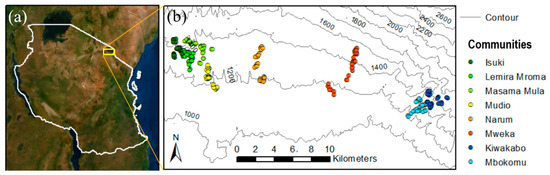 Location of the research area within Tanzania (a) and the distribution of the respondents along the southern slope of Mt. Kilimanjaro, divided into the eight communities (b).