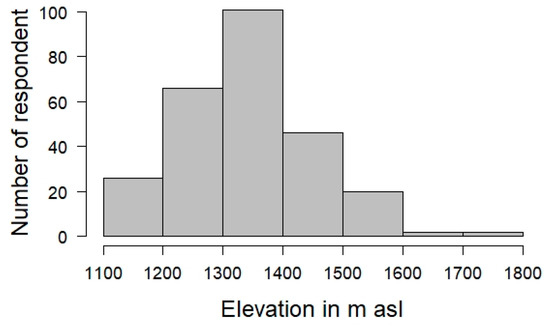 Of the total respondents, 96 were women (36.5%) and 167 men (63.5%). The farm size ranged between 0.1 and 8 ha, the average farm size was 0.7 ha with 83.3% (219 respondents) having less than 1 ha. The elevation ranged from 1148 m to 1748 m asl, with an average elevation of 1343 m asl and a median elevation of 1336 m asl (Figure 2). Ninety-seven respondents (37%) were members of the HRNS, while 166 were non-members (63%).