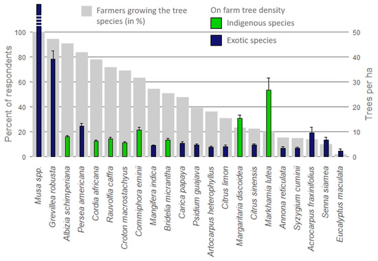 Percent of respondents reporting each species on their farm and average (+SE) tree density on those farms. The density of Musa spp. is much higher than the scale shown in the graph (1089 trees per ha on average).