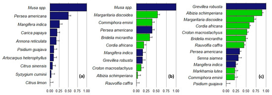 Scores and quasi-standard errors of the tree species ranked according to: (a) increase of coffee yield and quality, (b) protection from heat, wind and shade provision and (c) mulch provision, soil fertility and soil moisture enhancement. Green bars represent indigenous, and dark blue bars exotic tree species.