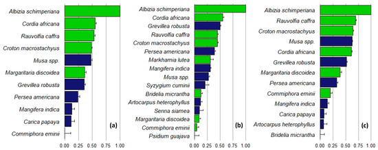 Scores and quasi-standard errors of tree species for (a) food provision, (b) fodder supply and (c) firewood supply. Dark blue bars represent exotic, and green bars indigenous tree species.