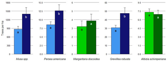 Food, fodder, and firewood are the most important ESs for small-scale coffee farmer households (99 respondents (37.8%) selected this combination). To assess the influence ES priorities have on tree species selection, we averaged the scores of each shade tree species for the combination of these three ESs and compared the density of the five best performing tree species between two groups: respondents that selected these three ESs as most important versus those that did not. The planting density of three of these five tree species is significantly higher (t-test, p < 0.05) for respondents that selected these ESs as most important compared to those that did not (Figure 6). We found differences for exotic, but not indigenous species.