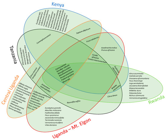 Shade tree species in coffee agroforestry systems vary greatly among regions and even within East Africa; hence, it is not possible to generalize findings for the region. Studies with a similar approach to farmers’ knowledge of tree species have been carried out in Rwanda [25], Uganda [16,24], and Kenya [15]. Figure 7 combines the tree species included in the rankings and shows the overlaps in the species reported. Only seven shade tree species were commonly recorded in all countries and most of them are exotic. There are also very important tree species that only appear in the ranking of one country, for example A. schimperiana, the most important shade tree species for the Mt. Kilimanjaro region.