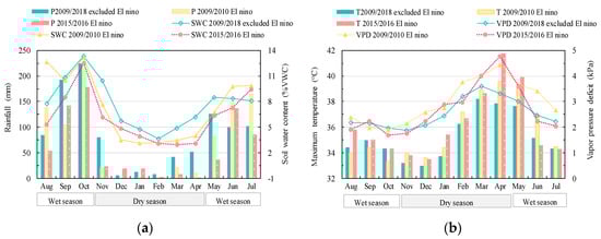 The amount of rainfall during the El Niño were as low as 59.1 and 71.4 mm during the dry season, i.e., ~30% of the total rainfall in typical years. During the dry seasons 2009/2010 and 2015/2016, the rainfall was even lower than 25 mm for six consecutive months compared to only three months during the non-El Niño dry seasons. The lower rainfall during both events resulted in lower soil moisture (<5% VWC) for five consecutive months instead of three months during usual dry seasons (Figure 1a). The mean temperature was not much different between El Niño and non-El Niño years, but the maximum temperature was significantly higher in April 2016 (41.7 °C). The maximum vapor pressure deficit (VPD) increased sharply (Figure 1b) with the highest VPD at 4.8 kPa in April 2016. This indicates the high-water vapor demand in surrounding air during that dry season. The severe El Niño induced drought periods were characterized by low rainfall, low soil water deficit, warmer and drier air condition. In fact, the 2015/2016 El Niño has been reported as one of the top three strongest El Niño in the historical records since 1950 and the first strong El Niño in the 21st century [34].
