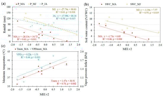 Relationships between Multivariate El Niño/Southern Oscillation (ENSO) index (MEI.v2) and microclimate variables consisting of (a) rainfall (P), (b) soil water content (SWC) and (c) maximum air temperature (Tmax) and maximum vapor pressure deficit (VPDmax) during March-April (MA), May-June (MJ) and July-August (JA) between 2009 and 2018.