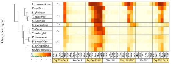 Regarding leaf senescence, the differences among species were not quite clear and this made the clustering analysis difficult. However, it is noted that most of the species showed earlier leaf senescence with a narrower time window between December and January during the 2015/2016 El Niño. In other dry seasons, this typically occurs between December and February (Figure S4). L. coromandelica (Houtt.) Merr. and E. succirubrum Gagnep. were distinguished from other species (Figure S4).