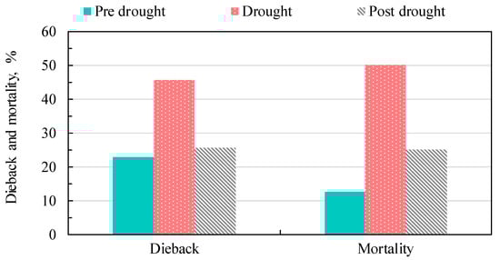 Percentage of dieback and mortality during pre-drought (Dry season 2014/2015–wet season 2015), drought (Dry season 2015/2016–wet season 2016), and post-drought (Dry season 2016/2017–wet season 2017).