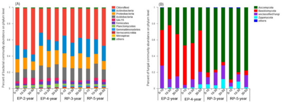 Percent of microbial communities’ abundance on phylum level along three soil depth (0–10 cm, 10–30 cm, 30–50 cm) under 2-year-old and 4-year-old Eucalypt plantations (EP-2-year and EP-4-year) and 3-year-old and 5-year-old Rubber plantations (RP-3-year and RP-5-year). (A), percent of the top bacterial phyla abundance. (B), percent of the top fungal phyla abundance. The phyla with abundance less than 0.01 percent were defined as others.