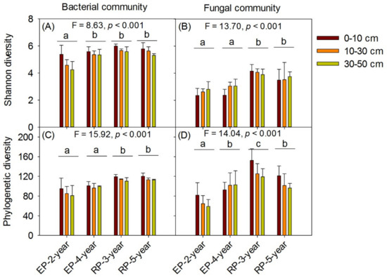 The α-diversity of soil bacterial and fungal communities along three soil depth (0–10 cm, 10–30 cm, 30–50 cm) under 2-year-old and 4-year-old Eucalypt plantations (EP-2-year and EP-4-year) and 3-year-old and 5-year-old Rubber plantations (RP-3-year and RP-5-year). AB, the taxonomic diversity indicated by Shannon Wiener index. CD, the phylogenetic diversity indicated by Faith’s Phylogenetic α-Diversity index. Lowercase letters above the grouped bars indicate the differences among the four plantations. F-statistic and p values (df = 8) represent the overall difference of the four plantations based on one-way ANOVA analysis.