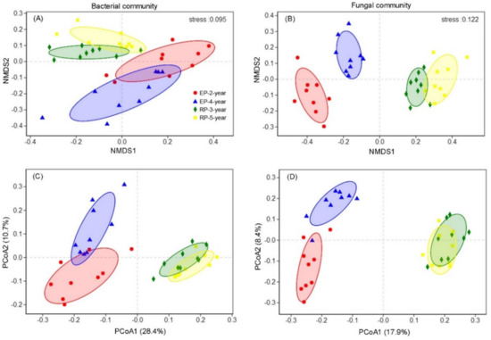 Non-metric multidimensional scaling (NMDS) ordination and principal coordinates analysis (PCoA) showing the structure differences of soil bacterial (AC) and fungal (BD) communities among the four Rubber and Eucalypt plantations (EP-2-year, EP-4-year, RP-3-year, RP-5-year). The NMDS analysis was performed based on Bray-Curtis dissimilarity matrix, and the PCoA was conducted with the Unweighted Unifrac dissimilarity matrix.