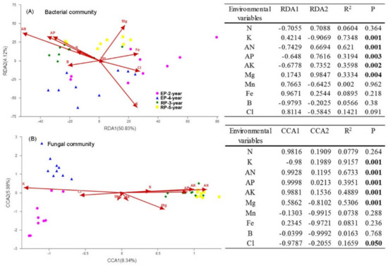 Constrained ordination analysis of microbial communities in 2-year-old and 4-year-old Eucalypt plantations (EP-2-year and EP-4-year) and 3-year-old and 5-year-old Rubber plantations (RP-3-year and RP-5-year). (A) Redundancy analysis (RDA) of bacterial community composition and environmental attributes. (B) Canonical correspondence analysis (CCA) of fungal community composition and environmental attributes. The relationships between soil variables and the two axes were indicated in the insert tables. Soil total nitrogen (N), total potassium (K), available nitrogen (AN), available phosphorus (AP), available potassium (AK), magnesium (Mg), manganese (Mn), iron (Fe), boron (B), and chlorine (Cl) were selected in the RDA and CCA model after excluding the variables with high variance inflation factor (>10).