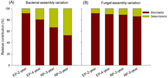 Understanding microbial assembly processes is a central goal in the field of microbial ecology, as it can reveal the fundamental rules for microbial taxonomic and phylogenetic structure across temporal and spatial scales [1,2,3]. Assemblage of microbial communities can be governed by deterministic processes that are imposed by environmental selections, which are traditionally recognized as the most important processes modulating microbial community evolution and diversification [4,5,6]. In recent years, the stochastic processes, such as drift, dispersal limitation and birth and death, have been proposed to interact with deterministic processes during microbial assembly in various ecosystems [7,8,9,10]. Moreover, the relative importance of deterministic versus stochastic processes in regulating microbial community structure can be highly variable across habitats. Some studies have proposed an increasing proportion of deterministic processes along the chronosequence of long-term disturbances, though emphasis has been given to the stochastic processes at the initial stage of disturbance [10,11]. Although soil microbiota is jointly shaped by the deterministic and stochastic processes under anthropogenic disturbances, such as fertilization [12], climate warming [11], and land use changes [10], the relative importance of these two processes is still unclear.