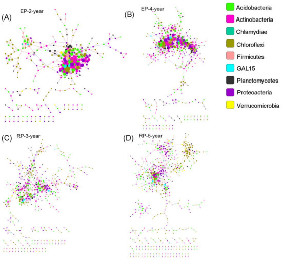Soil bacterial species co-occurrence networks in the studied plantations. (A,B) Structure of the networks in 2-year-old and 4-year-old Eucalypt plantations (EP-2-year and EP-4-year). (C,D) Structure of the networks in 3-year-old and 5-year-old Rubber plantations (RP-3-year and RP-5-year). The taxonomic affiliation of each operational taxonomic unit (OTU) is specified to phylum, using node color, and the node size is proportional to its connectivity. The blue lines between each two-node structure indicate positive interactions, while blue ones indicate negative interactions.
