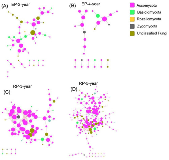 Soil Fungal species co-occurrence networks in the studied plantations. (A,B) Structure of the networks in 2-year-old and 4-year-old Eucalypt plantations (EP-2-year and EP-4-year). (C,D) Structure of the networks of 3-year-old and 5-year-old Rubber plantations (RP-3-year and RP-5-year). The taxonomic affiliation of each OTU is specified to phylum, using node color, and the node size is proportional to its connectivity (i.e., degree). The red lines between each two-node structure indicate positive interactions, while blue ones indicate negative interactions.