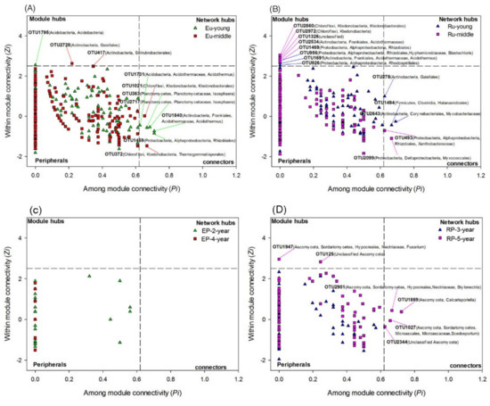 Topological roles of OTUs in the bacterial and fungal co-occurrence networks as indicated by the Zi-Pi plot. (A,C) The Zi-Pi plot of soil bacterial and fungal networks in 2-year-old and 4-year-old Eucalypt plantations (EP-2-year and EP-4-year). (B,D) The Zi-Pi plot of soil bacterial and fungal networks in 3-year-old and 5-year-old Rubber plantations (RP-3-year and RP-5-year). Network module hubs and connectors represent keystone taxa and are labeled with their OTU numbers and taxonomic affiliations. The nodes with Zi > 2.5 are identified as module hubs, and those with Pi > 0.62 are connectors. The network hubs are determined by Zi > 2.5 and Pi > 0.62, and the peripherals are characterized by Zi < 2.5 and Pi < 0.62 [47].