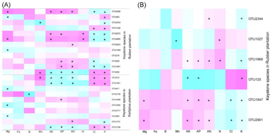 The topological roles of the nodes in networks were identified from the Zi-Pi plot. The majority of the nodes in both bacterial (~99% of the total nodes) and fungal (97–100% of the total nodes) networks were classified as peripheral, and they were highly connected within their own modules (Figure 8). A total of ten nodes from bacterial networks acted as module hubs and connectors, but the number of these nodes and their taxonomic affiliations differed among the four plantations. For example, in the EP-2-year, only one node belonging to Acidobacteria acted as module hub, and four nodes belonging to Acidobacteria, Actinobacteria, Planctomycetes and Proteobacteria were identified as connectors (Figure 8A). In the EP-4-year, two nodes affiliating to Actinobacteria were categorized into module hubs and two nodes belonging to Chloroflexi were identified as connectors (Figure 8A). In the RP-3-year, six nodes assigned to Proteobacteria, Actinobacteria and Firmicutes were grouped into module hubs and connectors (Figure 8B). Five and three nodes belonging to Chloroflexi, Proteobacteria and Actinobacteria were identified as module hubs and connectors in the RP-5-year (Figure 8B). Most of the identified module hubs and connectors for EP were positively correlated with soil K, Cl and Mn content, while negatively related to Mg, AK, AP, AN and N content (Figure 9A). The module hubs and connectors from RP, however, were generally supported by high Mg, AK, AP, AN and N content and low K and Cl content, except OTU956, OTU1326 and OTU493 (Figure 9A). Regarding fungal networks, only the network from RP-5-year had two nodes identified as module hubs and four connectors, which belonged to Ascomycota (Figure 8B). Moreover, the fungal network module hubs and connectors from RP-5-year were positively correlated with Mg, AK, AP, AN, and N content, while negatively related to Cl and K content (Figure 9). This was consistent with the constrained ordination results showing contrasting environmental associations with microbial community structure between EP and RP. In general, soil microbial networks in RP contained more keystone species than those in EP, which may lead to a more effective organization of species connections in networks from RP as regulated by more module hubs and connectors. The relationships of keystone species and soil properties were different between EP and RP, which to a certain extent indicated that the dominant factors shaping soil microbial networks were specific in EP and RP.