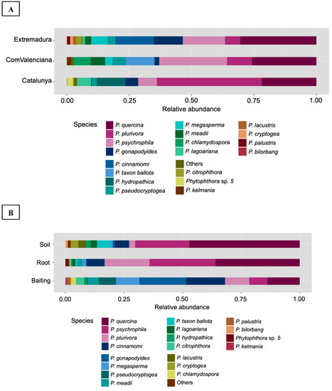 Relative abundance of Phytophthora species detected in the three studied regions from 2013 to 2015 showing more than 1% relative abundance of all reads. Species representing less than 1% of the total reads are grouped in “others”. (A): According to the factor region; Extremadura, Comunidad Valenciana (ComValenciana) and Cataluña (Catalunya). (B): According to the factor type of material; soils, roots and baitings. Results of the survey performed in Extremadura in 2012 are excluded in this analysis, since only soil samples were included.