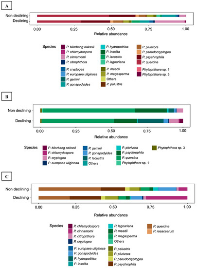 Regarding symptomatology, non-declining holm oak samples in the Extremadura present a higher diversity of Phytophthora species either in the 2013 survey or analyzing 2012 and 2013 together, than samples from declining trees (Figure 2A,C), but this diversity was slightly higher in declining samples in the 2012 survey (Figure 2B).