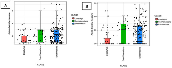 In the Extremadura region where the factor symptomatology was studied, in 2012 alpha diversity measured by the Chao1 estimator results was significant for the factor symptomatology (p value = 0.0218), but the Shannon Index was non-significant (p value = 0.1303). Nevertheless, in 2013 the ANOVA shows that both estimators were significant for the factor material and non-significant for the factor symptomatology (Table 3).