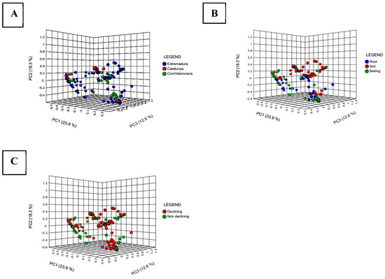 The principal coordinates analysis (PCoAs) of Bray Curtis show that the Phytophthora population in Extremadura had more variation in the number of species present, although there were similarities with the populations of the other two regions (Figure 4A). There are no significant differences in the diversity of Phytophthora species detected in the type of material used or the symptomatology of the sampled trees (Figure 4B,C).