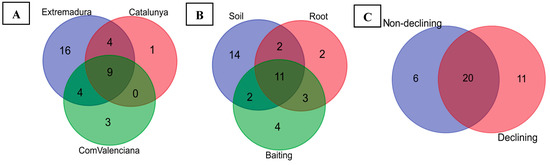 Venn diagram showing the overlap of operational taxonomic units (OTUs) identified in the Phytophthora population present in the holm oaks surveyed in the study according to the different factors studied. (A): Regions surveyed; Extremadura, Comunidad Valenciana (ComValenciana) and Cataluña (Catalunya), (B): Type of material used for the detection; roots, soils and baitings. (C): Symptomatology of the holm oaks sampled: declining and non-declining.