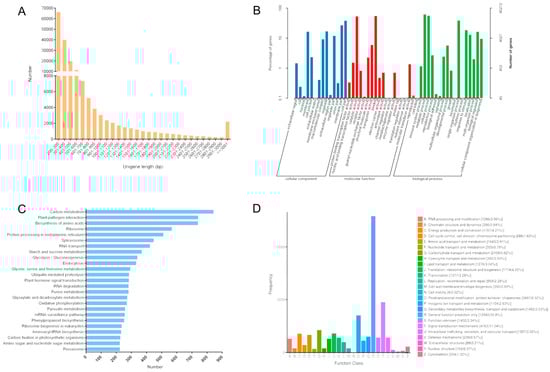 The Trinity software was used to assemble the clean reads for the 10 samples. The initial assembly produced 206,515 transcripts, of which the longest and shortest transcripts were 15,707 bp and 201 bp, respectively. The average transcript length was 601 bp, with an N50 of 786 bp. Furthermore, the low-abundance transcripts were filtered to obtain 177,894 unigenes, with an average length of 560 bp and an N50 of 689 bp (Table 4). Unigenes comprising 200–300 bp accounted for the largest proportion of the total (66,284, 37.26%), whereas unigenes consisting of 200–1000 bp, 1000–2000 bp, and 2000–3000 bp accounted for 88.34% (157,153), 7.84% (13,960), and 2.56% (4559) of the total, respectively. Additionally, 2222 unigenes (1.25%) were longer than 3000 bp (Figure 1a).