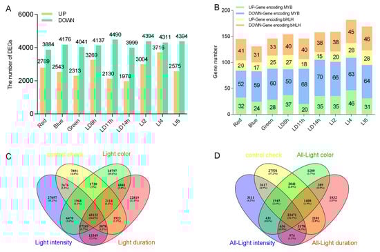 Differentially expressed genes in response to various light conditions. (a) Up-regulated and down-regulated genes in each treatment group. (b) Differentially expressed genes encoding MYB and bHLH transcription factors. (c) Venn diagram presenting the genes expressed in the control group and the genes expressed in response to at least one treatment for each light condition. (d) Venn diagram presenting the genes expressed in the control group and the genes expressed in response to all of the light treatments.