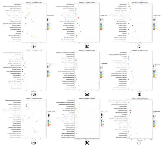 Pathways enriched among the identified DEGs. (a–i) Enriched KEGG pathways among the DEGs in response to the red, blue, green, LD8h, LD11h, LD14h, LI2, LI4, and LI6 light treatments, respectively. Pathway names are provided on the vertical axis, whereas the enrichment factor is presented on the horizontal axis. The size of each point indicates the number of DEGs in a particular pathway, whereas the color of each point corresponds to the Q score range.