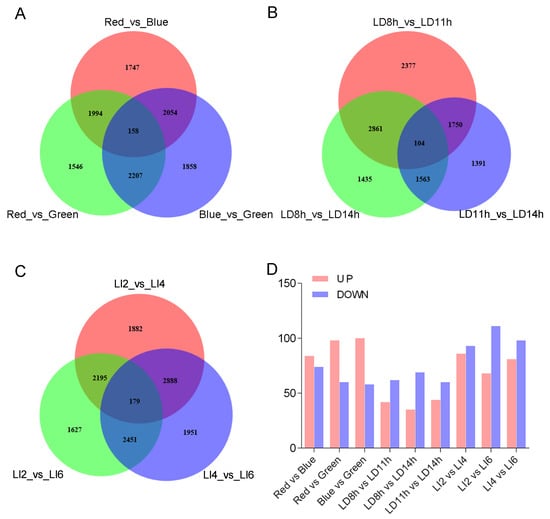 Differentially expressed genes (DEGs) in response to three light conditions. (a) Venn diagram presenting the DEGs in a pair-wise comparison of light quality treatments. (b) Venn diagram presenting the DEGs in a pair-wise comparison of photoperiod treatments. (c) Venn diagram presenting the DEGs in a pair-wise comparison of light intensity treatments. (d) Data regarding the up- and down-regulated genes in pair-wise comparisons of light conditions.