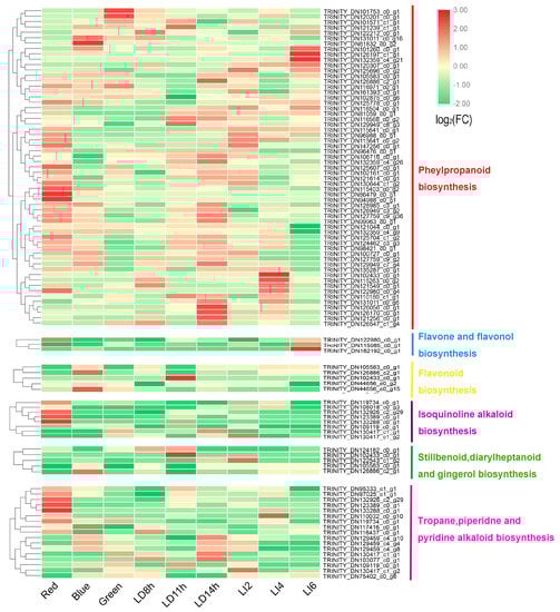 A KEGG pathway enrichment analysis revealed that the secondary metabolite contents changed in the light-treated samples. We further analyzed six common pathways for the synthesis of secondary metabolites that were significantly enriched among the DEGs. The “phenylpropanoid biosynthesis” (ko00940) and “tropane, piperidine and pyridine alkaloid biosynthesis” (ko00960) pathways were significantly enriched among the DEGs in all light treatments. The “isoquinoline alkaloid biosynthesis” (ko00950) pathway was significantly enriched among the DEGs identified following the other treatments, except for the 8-h exposure to daylight and the green light treatment. The “flavonoid biosynthesis” (ko00941) and “stilbenoid, diarylheptanoid and gingerol biosynthesis” (ko00945) pathways were significantly enriched among the DEGs following the blue light treatment, 14-h exposure to daylight, and the 2000 lx treatment, whereas the ‘flavone and flavonol biosynthesis’ (ko00944) pathway was significantly enriched among the DEGs of four light treatments (i.e., blue light, 11-h exposure to daylight, and the 2000 lx and 3000 lx light intensities) (Figure 5).