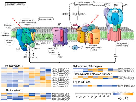 Photosynthesis in green plants is important for converting energy and maintaining the carbon–oxygen balance in the atmosphere. Light is the main environmental factor affecting plant photosynthesis. Therefore, besides the DEGs related to the synthesis of secondary metabolites, we also identified DEGs associated with the “photosynthesis” (ko00195) pathway (Figure 6). This KEGG pathway was not enriched among the DEGs due to the red light treatment and the 11-h exposure to daylight. The expression of unigenes related to photosystem I (PSI) was mostly up-regulated by light, whereas the expression of unigenes associated with photosystem II (PSII) exhibited the opposite trend. The TRINITY_DN119118_c5_g3 and TRINITY_DN121899_c3_g1 unigenes both encode an apolipoprotein of PSI P700 chlorophyll a. However, TRINITY_DN119118_c5_g3 expression was down-regulated by 2000 lx, whereas TRINITY_DN121899_c3_g1 exhibited the opposite trend. The expression of TRINITY_DN94895_c0_g1, which encodes an ATP synthetase, was significantly down-regulated by the 14-h exposure to daylight as well as the 2000 lx and 3000 lx treatments. Moreover, TRINITY_DN132065_c1_g1, which encodes cytochrome b6, and TRINITY_DN118867_c0_g2, which encodes the cytochrome b6-f complex, exhibited down-regulated expression in response to green light and 2000 lx, respectively. The expression levels of two unigenes (TRINITY_DN121378_C0_G2 and TRINITY_DN113202_c2_g1) involved in photosynthetic electron transport were up-regulated by the 8-h daylight treatment and down-regulated by 1000 lx.