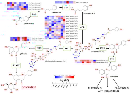 Differentially expressed genes in the phlorizin accumulation pathway. The different colors in the heat map show unequal expression levels, and red and blue in the formula represent oxygen and nitrogen atoms, respectively.