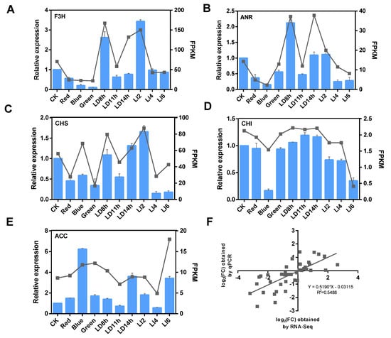 Light-induced L. polystachyus gene expression determined by qRT-PCR. (a–e) Expression levels of selected genes. The y-axis on the left indicates the relative expression levels determined by qRT-PCR (blue histogram), whereas the y-axis on the right indicates the expression levels based on the RNA-seq data (gray line chart). The x-axis indicates the light treatments. (f) Comparison between the log2 fold-changes calculated based on the RNA-seq and qRT-PCR data.