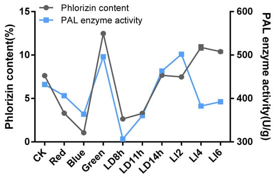 Changes to the phlorizin content and PAL activity due to various light treatments. The gray and blue lines correspond to the phlorizin content and PAL activity, respectively. The phlorizin content refers to the percentage of the extracted phlorizin mass to the dry weight of the sample.