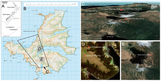 Campbell Island. Location in the southern part of the ocean (A), topographic map (B), oblique view, Perseverance Harbour (C), vertical view, Homestead Ridge bog (D), vertical view, and Mount Honey Saddle bog (E). Imagery from Google Earth.