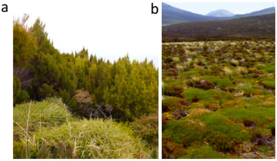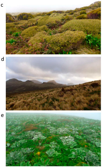 The vegetation and plant ecology of Campbell Island is documented in References [16,18,19]. Key vegetation types are shown in Figure 2a–d. Well drained, sheltered lowland sites are in a low forest (≤5 m) or scrub dominated by Dracophyllum scoparium and Dracophyllum longifolium over the subdominant shrubs Myrsine divaricata and Coprosma ciliata, and a fern ground cover of Polystichum vestitum. The tree line is defined as the presence of groups of trees at least 3 m tall [6] and, by this standard, the Campbell Island tree line sits at 30 m a.s.l. (Figure 2a), even though Dracophyllum stands up to 2.5 m tall dominate sheltered sites up to 120 m elevation. We regard this elevational range as a tree line ecotone. Myrsine and Coprosma shrublands become more abundant with increasing elevation and are often the main cover from 100 m to 250 m on sheltered slopes where the last shrubland patches occur (Figure 2c). Chionochloa antarctica tussock grassland is the main vegetation above 150–200 m (Figure 2d) but, in turn, intergrades with a herb field of macrophyllous forbs (Anisotome antipoda, A. latifolia, Pleurophyllum hookeri, P. speciosum, and Bulbinella rossii), which become prominent above 250–300 m (Figure 2e). The open, exposed tops (above 300 m) are in a tundra of low-growing macrophyllous forbs, sedges, rushes, and stunted grasses.