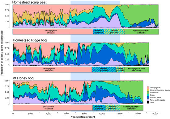 Summary percentage pollen and spore diagrams for Homestead Scarp Peat (HSP), Homestead Ridge Bog (HRB), and Mount Honey Bog (MHB). Blue vertical shading represents the period during the Holocene (12,000 to 6500 BP) when the tree line was repressed.