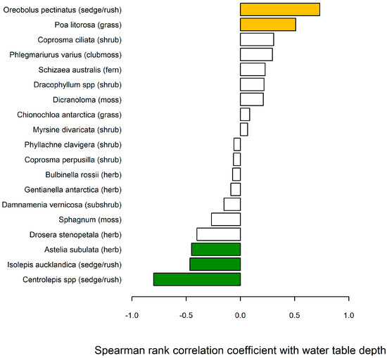 Homestead Ridge Bog. Vegetation cover percentage correlations with the water table. Green-filled bars are statistically significant negative correlations, yellow bars are statistically significant positive correlations, and empty filled bars are not statistically significant.