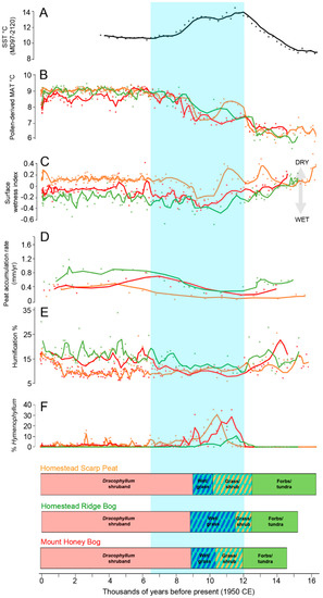 A surface wetness indicator was developed from an ordination of three sites (HRB, HSP, and MHB) and the modern surface sample data was presented in Reference [24] (Figure 5c). The second axis is well aligned with the results of the modern water table depth results, with Dracophyllum and ferns contrasted with Astelia antarctica and Centrolepis spp. (Figure S4). The two bog sites (HRB and MHB) show a decline surface wetness from 14,000 BP onwards. The maximum wetness is evident between 10,500 and 9000 BP while the forest site (HSP) has fluctuating but dry conditions along with markedly increased moisture between 10,500 and 9000 BP (Figure 5c). All three sites became drier shortly after 9000 BP and followed a fluctuating trend toward less surface moisture, which culminated between 6000 and 2000 BP.