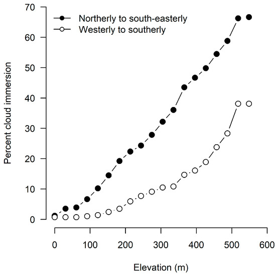 Percent of observations in which given elevations on the Mt Honey transect, Perseverance Harbour, Campbell Island were within the cloud base. A total of 576 twice daily (09:00 and 16:00 h) observations of cloud base were made from 1 March to 3 October 1991. Winds from northerly to south-easterly quarter (solid line) bring much lower cloud bases than those from westerly to southerly quarter (broken line). From Reference [10].