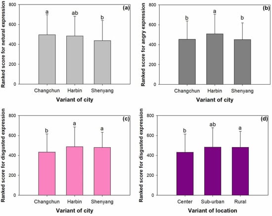 Ranked scores for neutral (a), angry (b), and disgusted (c) facial expressions among different cities and those for disgusted facial expression among different forest-park locations across cities (d). Different letters indicate significant difference of ranked scores between any couple of the three comparisons according to Wilcoxon rank sum test at the 0.0167 level adjusted from the Bonferroni method. Error bars above columns indicate standard errors.