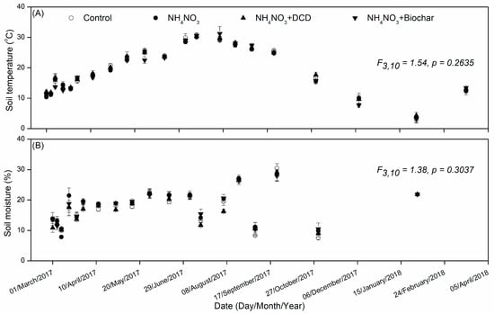 Soil (A) temperature and (B) moisture (mean ± standard error) over the 12-month study in Camellia oleifera Abel. field with the N and mitigation treatments. Repeated-measure one-way analysis of variance results are shown. N: nitrogen; DCD: dicyandiamide; NH4NO3: ammonium nitrate.