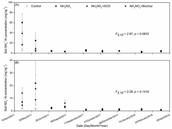 Soil inorganic N dynamics, including (A) NH4+-N and (B) NO3−-N (mean ± standard error), over the 12-month study in Camellia oleifera Abel. field with the N and mitigation treatments. Repeated-measure one-way analysis of variance results are shown. N: nitrogen; NH4+-N: ammonium nitrogen; NO3−-N: nitrate nitrogen; DCD: dicyandiamide; NH4NO3: ammonium nitrate.