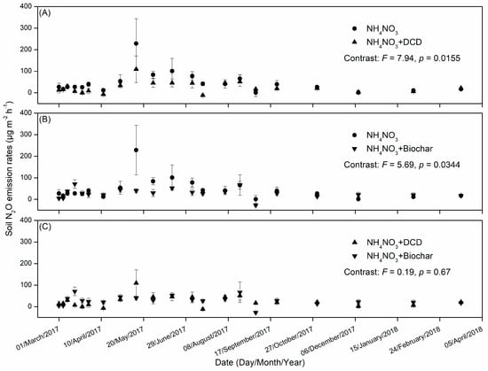 Soil N2O emissions (mean ± standard error) from soil with N, or N with DCD or biochar in a Camellia oleifera Abel. field. (A) NH4NO3 vs. NH4NO3 + DCD; (B) NH4NO3 vs. NH4NO3 + Biochar; (C) NH4NO3 + DCD vs. NH4NO3 + Biochar. Repeated-measure one-way analysis of variance and follow-up contrast results are shown. N: nitrogen; DCD: dicyandiamide; NH4NO3: ammonium nitrate; N2O: nitrous oxide.