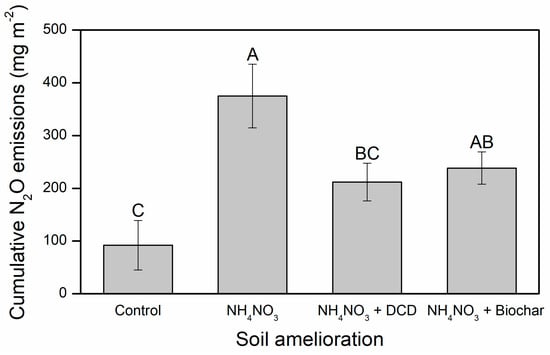 While N fertilization significantly increased soil N2O emissions compared with control treatment, DCD application decreased soil N2O emissions to similar levels as control treatment (Figure 3A and Figure 4). Even though biochar addition treatment did not significantly decrease N2O emissions from soil with N, the slight decrease in cumulative N2O emissions may potentially mitigate N2O emissions in prolonged study, which should be examined in future studies. However, DCD application significantly decreased cumulative N2O emissions and no significant difference was observed between control and DCD treatment (Figure 4), indicating DCD was effective in mitigation of N2O emissions from C. oleifera field relative to biochar. No significant differences were observed between DCD and biochar treatments in their effects on N2O emission rates (Figure 3C and Figure 4), indicating biochar application could be considered as a potential mitigation strategy of soil N2O. Similarly, both DCD and biochar reduced the yield-scaled N2O following N fertilization, while biochar showed stronger effects than DCD in N2O mitigation in a sweet corn field [].
