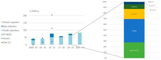 The deforestation dynamics computed by the model are also compared to data from available remote sensing products such as that used to define activity data as described in Section 2.3 and independent global-scale remote sensing products [,] clipped to the extent of the study area.