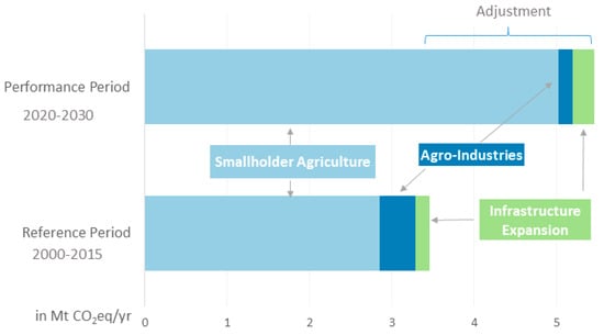 The resulting forest reference level (Figure 3) for the virtual performance period 2020–2030 with 5.63 MtCO2/yr is 1.26 MtCO2/yr or 29% higher than the emissions for the reference period. This adjustment is driven by the expansion of smallholder agriculture, from which the associated annual emissions are projected to increase by 48% from 2020–2030, as compared to the virtual reference period 2000–2015.