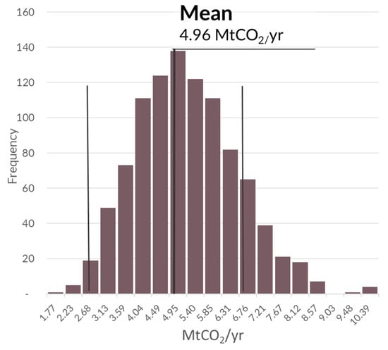 The spread of the results of the Monte Carlo analysis as shown in Figure 4. gives an indication of the sensitivity of the reference level calculation (AD*EF*Adj) where the adjustment term varies across five SSP scenarios. The resulting distribution is skewed to the right (with a skew factor of around 0.40) as can be expected due to the multiplication of normally distributed variables. The assumption of a normal distribution of the data can however be maintained since the skew factor is predominantly < 0.5 []. The mean FREL is 4.96 MtCO2/year and the confidence interval is ± 2.19 MtCO2/yr at a 90% confidence level (the z-score multiplier for the SD is 1.64). This means that the true mean value for the FREL lies between 2.73 and 6.78 MtCO2/yr in 90% of the iterations. The aggregated variation of the reference level expressed as the coefficient of the variation (SD divided by the mean) is 27%.